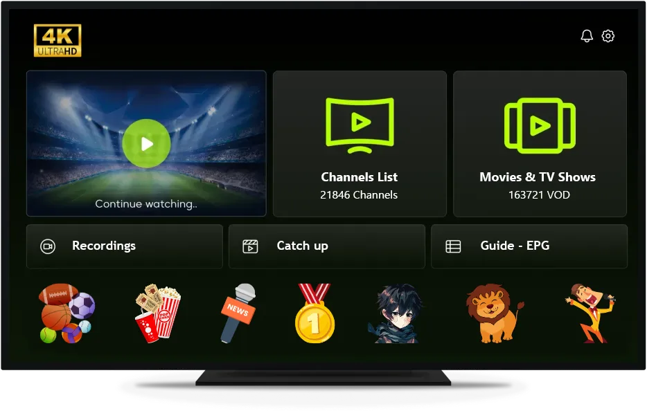 Divertissement illimité – Actualités, dessins animés, anime... IRON IPTV propose une vaste sélection d'actualités en direct, de dessins animés pour enfants, d'animes et de séries TV à succès du monde entier. Restez informés grâce aux chaînes d'information 24h/24 et 7j/7, divertissez vos enfants avec des dessins animés amusants et profitez des meilleures séries animées et séries TV populaires en HD et 4K. Regardez du contenu en streaming où et quand vous voulez grâce à notre service IPTV rapide et fiable !